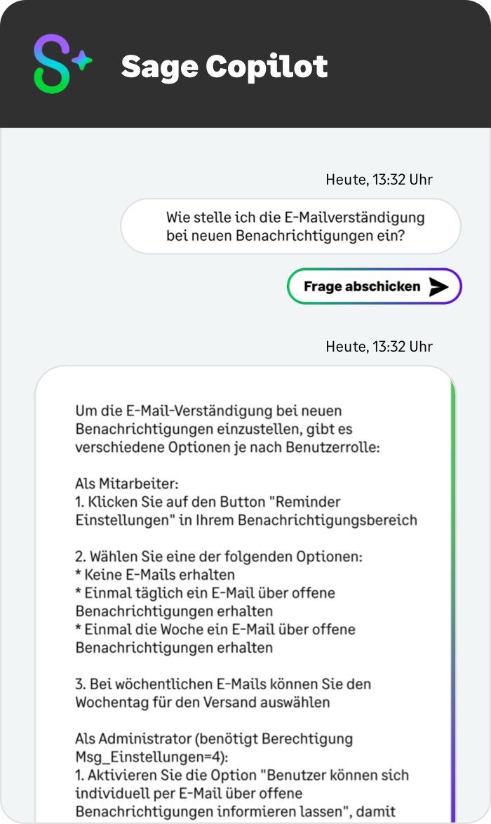 Ja. Die benutzerfreundliche Oberfläche von Sage Copilot ermöglicht es allen, von den Möglichkeiten der KI zu profitieren – auch ohne spezielle Vorkenntnisse. Dank großer Sprachmodelle (LLMs) liefert Sage Copilot Antworten, die wie von einer echten Person wirken.
